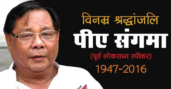 नई दिल्ली। पूर्व लोकसभा अध्यक्ष पी.ए संगमा का शुक्रवार को यहां दिल का दौरा पडऩे से निधन हो गया। वह 68 साल के थे। संगमा मेघालय के तुरा से नौ बार लोकसभा के लिए निर्वाचित हुए और पूर्वोत्तर क्षेत्र से आने वाले लोकसभा के पहले अध्यक्ष बने। उन्होंने आज सुबह यहां अपनी अंतिम सांसें लीं। लोकसभा अध्यक्ष सुमित्रा महाजन ने सदन में उनके निधन की जानकारी दी। सदन ने संगमा को श्रद्धांजलि दी और उनके सम्मान के तौर पर लोकसभा की बैठक आज दिनभर के लिए स्थगित कर दी गई। बाद में प्रोटोकॉल को दरकिनार करते हुए दोपहर के भोजनावकाश के बाद राज्यसभा की बैठक भी स्थगित कर दी गई ताकि सदस्य संगमा को श्रद्धांजलि दे सके। संगमा का पार्थिव शरीर मेघायल स्थित उनके घर ले जाया जाएगा। आम तौर पर उसी सदन की कार्यवाही स्थगित की जाती है, जिस सदन से सदस्य का देहांत होता है। संगमा के परिवार में उनकी पत्नी सारोदिनी, बेटे कोनराड और जेम्स एवं बेटी अगाथा है। कोनराड मेघालय के पूर्व वित्त मंत्री हैं, जेम्स एक निवर्तमान विधायक हैं और अगाथा 2009 में मनमोहन सिंह के मंत्रिमंडल की सबसे युवा मंत्री बनी थीं। अटल बिहारी वाजपेई के प्रधानमंत्री पद की शपथ लेने के बाद 11वीं लोकसभा में संख्या में कमी के कारण भाजपा को कांग्रेस उम्मीदवार संगमा को लोकसभा अध्यक्ष के तौर पर स्वीकारना पड़ा था।